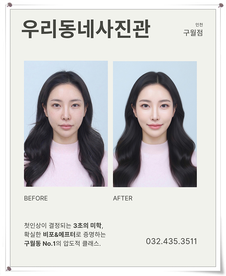 안녕하세요! 인천 증명사진의 메카, 우리동네사진관 인천구월점 관리자입니다. 인생의 중요한 순간을 기록하는 사진, 아무 곳에서나 찍을 수 없기에 멀리서도 저희를 찾아주시는 분들이 많습니다. 오늘은 왜 저희 사진관이 구월동을 넘어 인천 전체에서 사랑받는지, 그 특별한 이유를 가감 없이 전해드리려고 합니다.